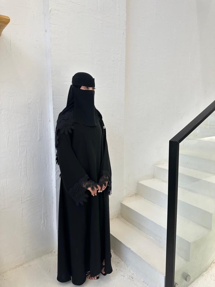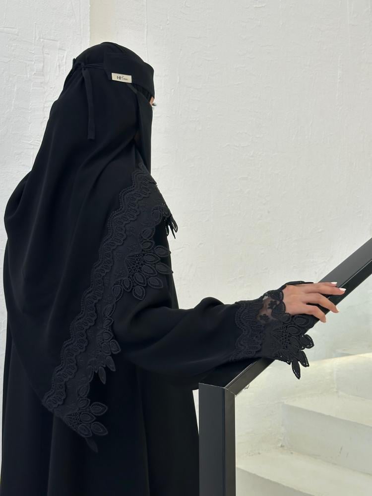 عباية تجمع بين رقة الزهر وفخامة الظهور، بقماش إنترنت كوري فاخر وقصّة نصف كلوش تنساب بأناقة. تكتمل تفاصيلها بكلفة جوبير راقية على الأكمام والطرحة، لتكون عنوانًا للجمال المحتشم
